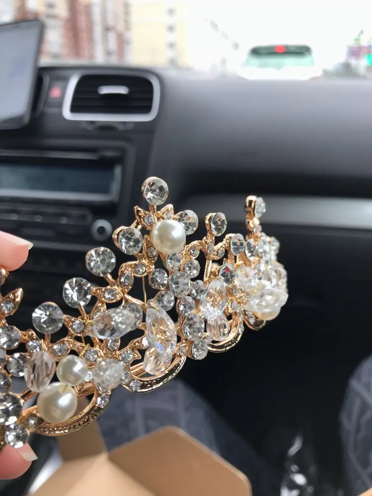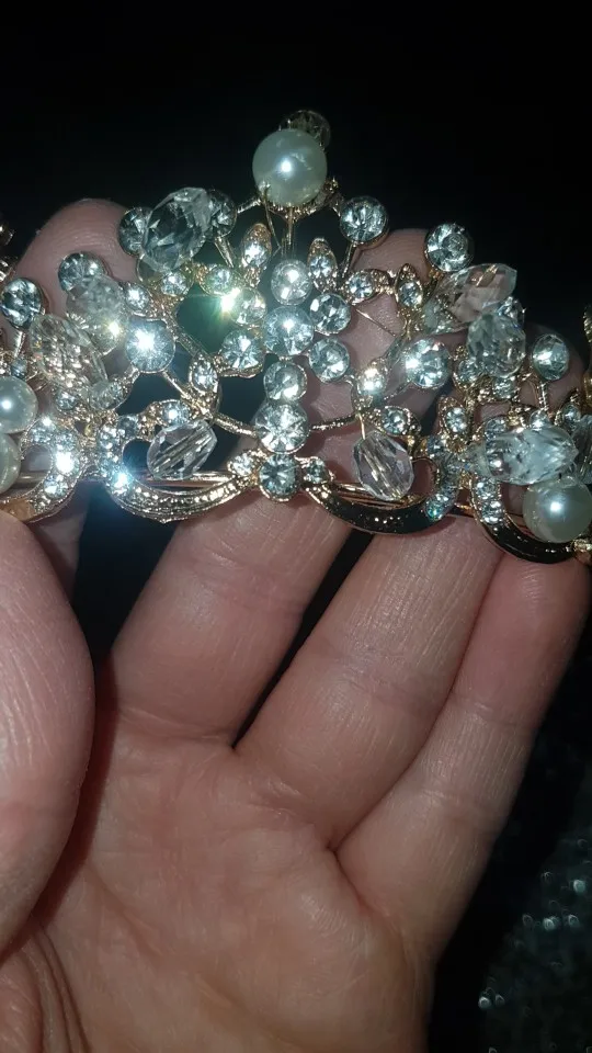 This fashion gold tiara is encrusted with sparkling clear genuine rhinestones of various sizes. The many rhinestones crystals make this crown sparkle in any light and are prong set by hands!